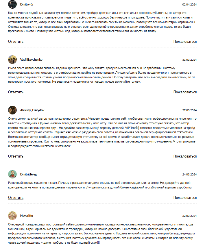 На такие мысли наводят и отрицательные отзывы о Вадиме Троцком на сторонних сайтах. Здесь довольных клиентов не найти, подписчики канала говорят про обман и развод на деньги, торговлю в убыток по сигналам трейдера.