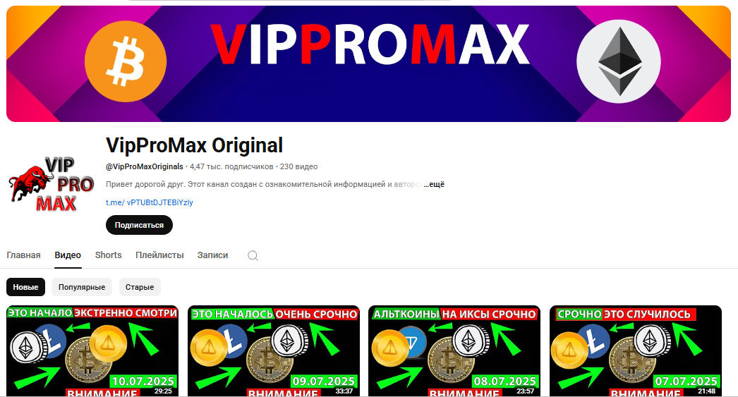 Авто‑приглашения ведут на YouTube‑канал с ≈4 тыс. подписчиков, где публикуются видео типа «что ждать от рынка» или прогнозы альткоинов. Кол‑во просмотров скромное — 1 тыс., что для 4 тыс. подписчиков неплохо, но не впечатляет.Транспарентность сигналов и риски