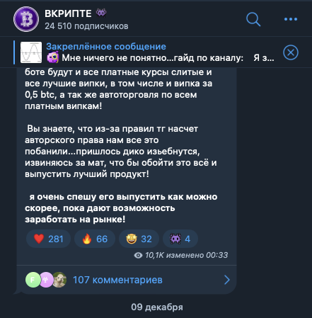 На телеграмм-канал «ВКрипте», vtrendetrade, на 21 декабря 2024-го года, подписано около 24,5 тысяч пользователей. Публикации просматривают в среднем 10 тысяч раз.