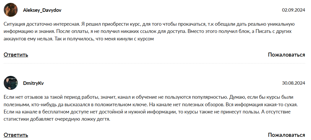 Изучая деятельность предпринимателя и настоящие отзывы на его канал “Трейдинг, Инвестиции, Московская биржа/Forex/Crypto/trading/инвестиции”, была найдено множество негативных комментариев его клиентов.