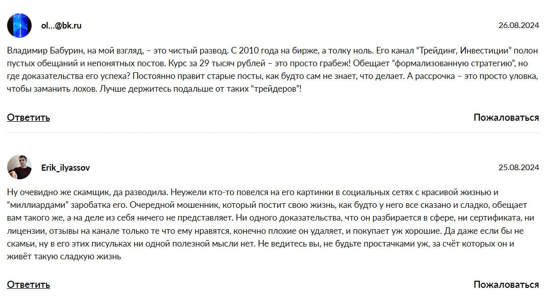 Мы проанализировали деятельность трейдера Владимира Бабурина и отзывы о нем, чтобы понять мошенник он или нет. Мы узнали, что его обучение как покупать и продавать акции, похоже на развод, а по его торговым сигналам можно потерять деньги.