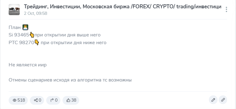 Посты канала посвящены рассказам админа о его безубыточной торговле и публикации торговых сигналов. Но в каждом хвалебном посте он оставляет приписку, что эта финансовая сделка не является инвестиционной рекомендацией и предлагает обучение.