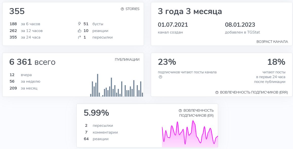 На канале всего 4 тысячи подписчиков, из них читают публикации 23%. Вовлеченность всего примерно 6%. Канал создан 1 июля 2021 года.