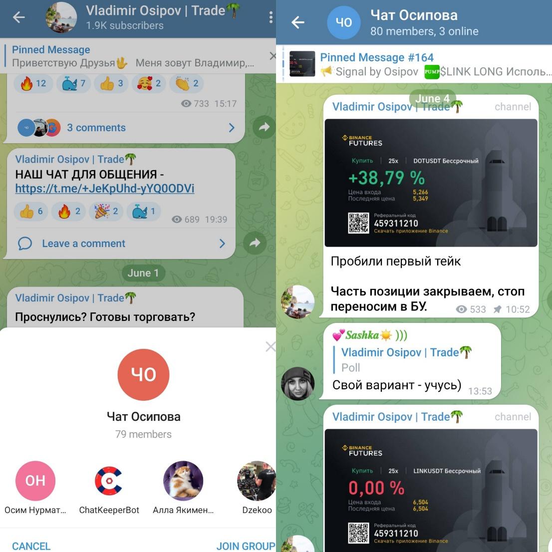 Официального сайта у трейдера нет, поэтому всю информацию прочитывать можно лишь на канале. Перейдя в Телеграм, мы видим описание, в котором указаны контакты личного аккаунта Осипова, а также ссылка на чат. В чате всего 80 подписчиков, и публикаций не так много. Все они связаны с криптовалютой и сигналами.