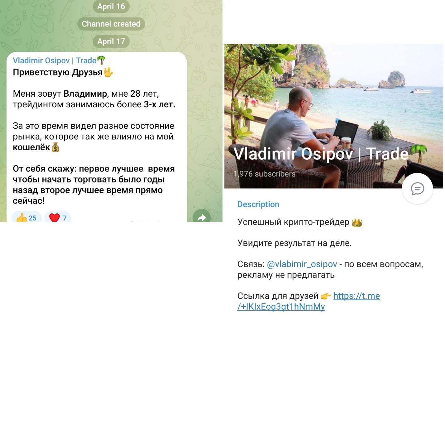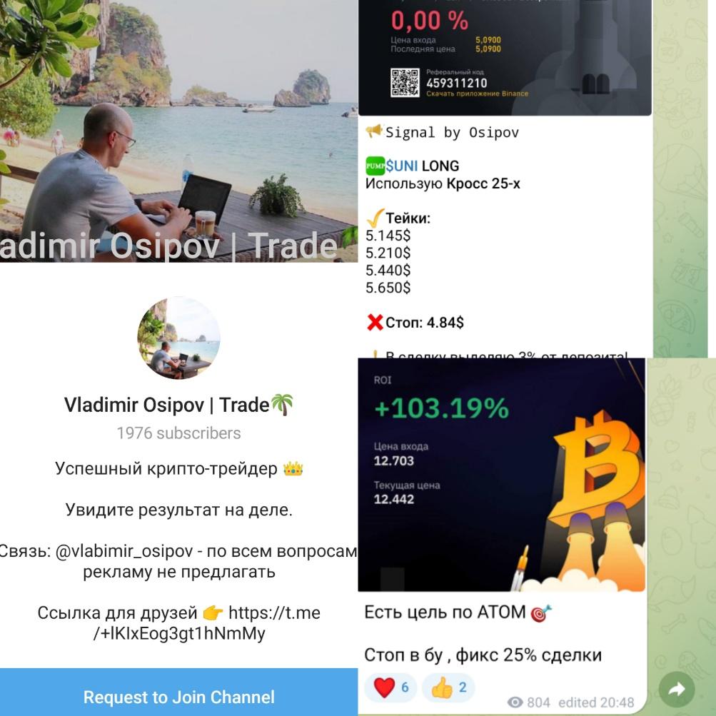 Владимир Осипов — создатель Телеграм канала о трейдинге. Сам себя называет крипто-трейдером с опытом более чем 3 лет. Аккаунт был создан с целью начинать заработок на криптовалюте. Поможет в этом, как упоминает автор, информация именно с этого канала. Проект запущен с апреля 2023 года, поэтому упоминаний в интернете о нем мало. Стоит отметить, что платных услуг на канале нет, а это и делает его подозрительным. Оценить проект и сделать выводы помогут правдивые отзывы и обзор.