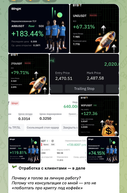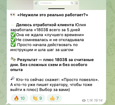 На telegram-канале присутствуют информация о том, что кому-то из последователей удалось заработать солидные деньги за короткий срок. Однако, доказательств этому трейдер не приводит.