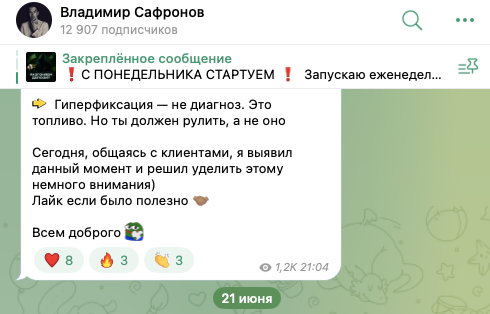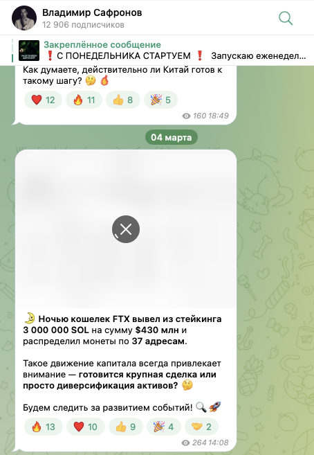 На телеграмм-канал «Владимир Сафронов», на 24 июня 2025-го года, подписано около 12,9 тысяч пользователей. Последние публикации на нем просмотрены в среднем по 1000-1200 раз.