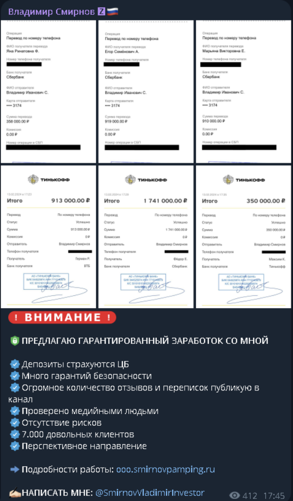 На канале Смирнова Владимира очень много публикаций со скриншотами банковских выписок. При этом, на этих изображениях демонстрировались довольно внушительные суммы – сотни тысяч и миллионы рублей.