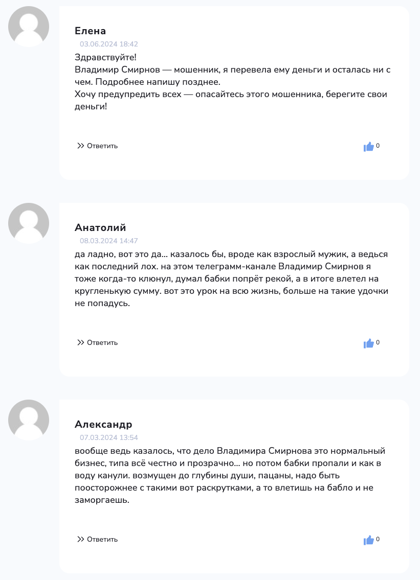 Отзывы о проекте Владимира Смирнова все негативные и в них пользователя SmirnovInvestor называют мошенником. В частности, в отзывах на канал/проект «российского миллионера» пишут, что после перевода средств админ/автор начинает раскручивать жертву на дополнительные вложения.