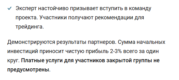 В разоблачениях пишут об агрессивном маркетинге крипты от Владислава Баженова. Участники закрытого клуба получались торговые сигналы и общие рекомендации для заключения прибыльных сделок на рынке. Владислав также обещал 2-3% дохода за одну торговую сессию.Способы пополнения баланса, вывода прибыли и гарантии на начало 2026 года неизвестны. Вполне возможно, для приема депозитов от пользователей использовались карты физлиц, что является ярким маркером скама.