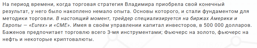 Заключать сделки трейдер предпочитает на американских и европейских биржах CME, Eurex и других. Основные инструменты для заработка – фьючерсы на золото и нефть, изредка – перспективные криптовалюты. В Интернете нет ссылок на профили Владислава, которые могли бы косвенно подтвердить существование капитала.