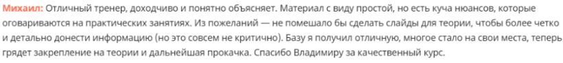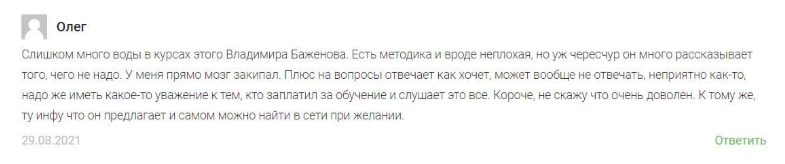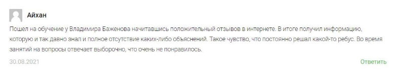 Отзывы о Владиславе Баженове и его курсах по трейдингу криптой в Интернете есть и положительные, и отрицательные. Михаилу понравились профессиональные навыки наставника, он отметил понятный язык изложения, структурированность материала. По прохождению обучения он получил необходимую для начала работы базу.