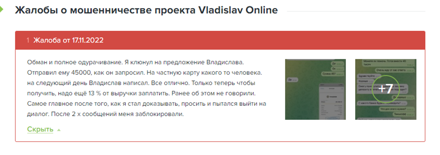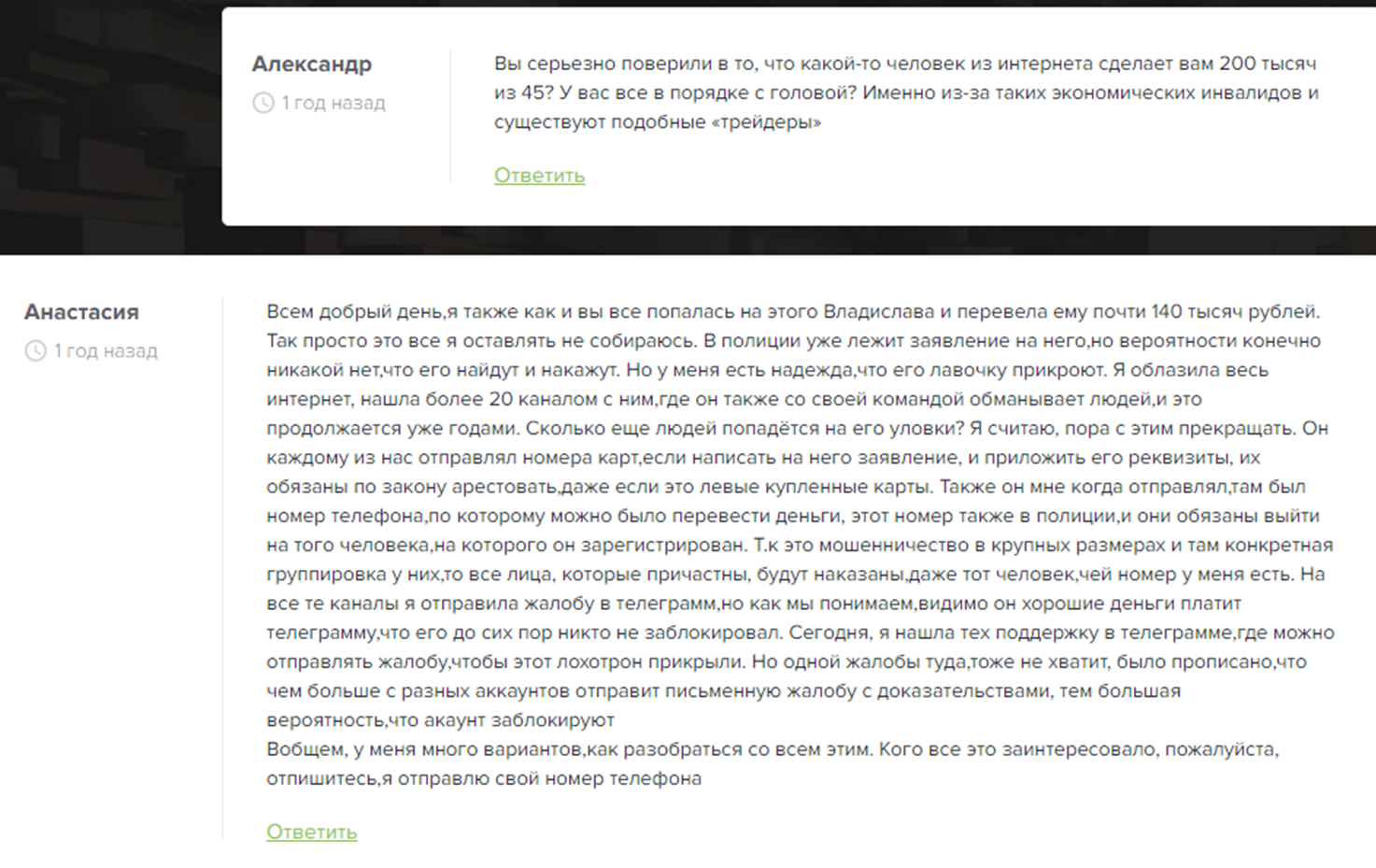 Положительные отзывы на инвестиции Владислава есть только на его канале в телеграмм, но они фальшивые.