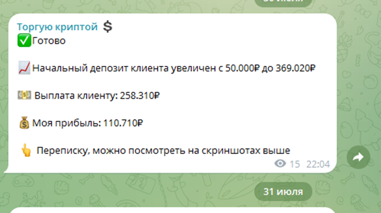 Единственная услуга в telegram канале Владислава — раскрутка счета. Принимаются депозиты от 50 000 рублей. Обещано, что уже через сутки инвестор получит минимум 300 процентов плюсом. То есть от 250 000 и более. За свои услуги Владислав берет комиссию в размере определенного процента от прибыли. Как именно он рассчитывается нигде не сказано.
