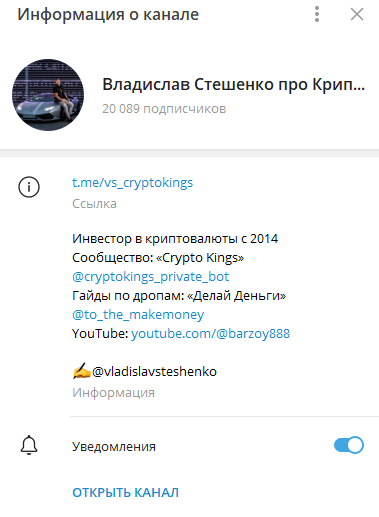 Владислав Стешенко про Криптовалюты – это Телеграм-канал трейдера, который предлагает подписчикам заработок на криптовалютах. По легенде, автор ресурса работает с токенами с 2014 года. Но эта информация в открытых источниках не подтверждается.