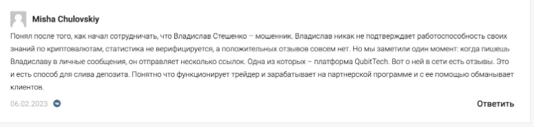 Во время нашей проверки мы также обнаружили несколько разоблачений этого трейдера в интернете. Их авторы уверены, что Владислав Стешенко не обладает авторскими стратегиями. А весь контент берет у других, более опытных трейдеров.