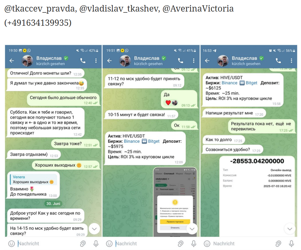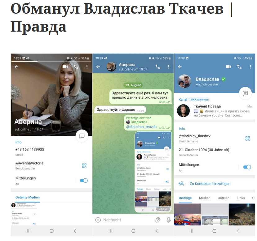 Один из обманутых пользователей раскрывает схему обмана от канала Ткачев правда, в которой участвует еще и некая @ AverinaVictoria. Группа мошенников стала сотрудничать с клиенткой под маскировкой финансовых наставников, которые зарабатывают на арбитраже крипты. Изначально сотрудничество шло неплохо. Начав с небольшой суммы, клиентка стала получать доходы. Однако как только переводы выросли, ее депозит был заблокирован. В процессе работы она регистрировалась на указанных Владиславом платформах и покупала рекомендуемые монеты.