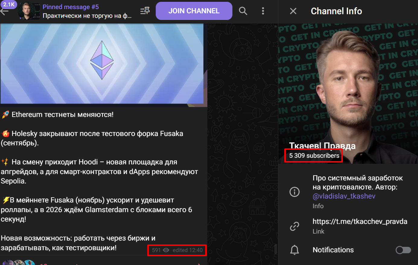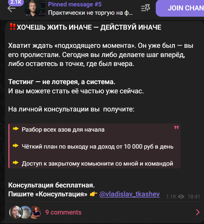 Владислав Ткачев является гуру по криптовалюте и призывает подписчиков своего канала Ткачев Правда, @ tkaccev pravda, получить бесплатную консультацию и присоединиться к совместному заработку на арбитраже. Изучив проект, наша редакция обнаружила тревожные признаки, которые связывают сообщество с еще одним каналом автора. Расскажем подробнее далее в обзоре.