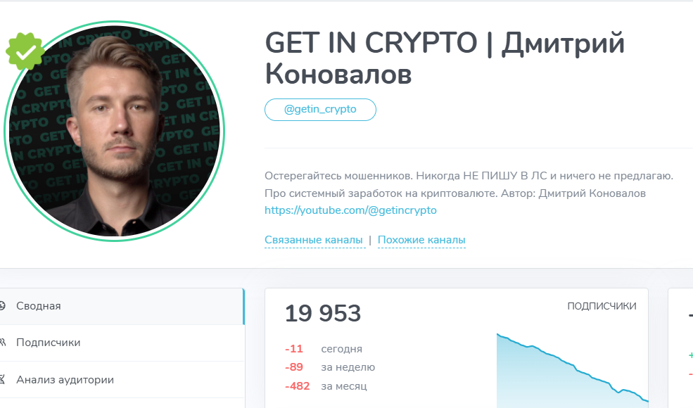Вещает про “системный заработок на криптовалюте” Vladislav tkashev и на другом канале – Get in crypto, только уже под именем Дмитрия Коновалова. Аудитория этого сообщества также является фальшивкой, все заявления об “экспертной экспертности” – пустышки.
