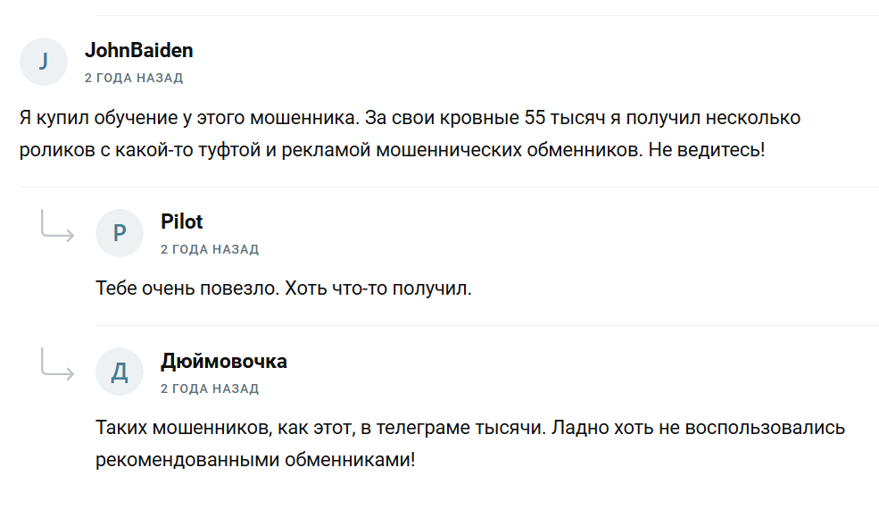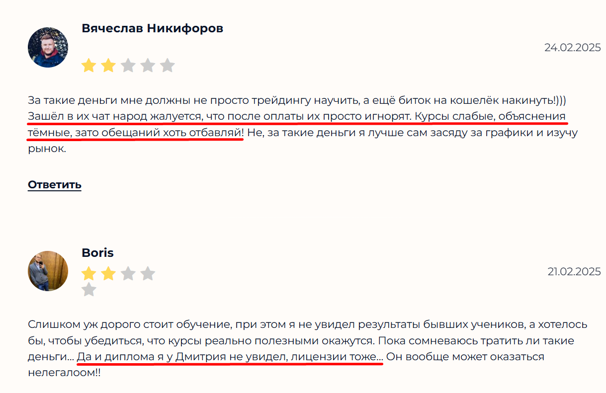 Отзывы о курсах, которые пытался впихнуть пользователям Дмитрий Коновалов, негативные. Пользователи отмечают, что финансовый коуч приводил их на обменники-скамеры.