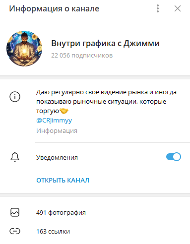Внутри Графика С Джимми – это Телеграм-канал, который специализируется на криптовалютном трейдинге. Его автор, известный под ником CRJimmyy, обещает пользователям эффективные торговые сигналы и рекомендации по инвестированию в токены. Основатель канала утверждает, что является опытным трейдером с многолетним стажем работы на криптовалютном рынке. Пишет, что специализируется в основном на фьючерсах. Некоторые сигналы публикуются в бесплатном канале, есть также вип-чат.