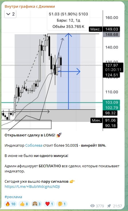 Основной заработок автора ресурса Внутри Графика С Джимми – это реклама различных Телеграм-каналов. Например, он пиарит ресурс 2Trade Kirill Sobolev, утверждая, что его автор предоставляет подписчикам бесплатно сигналы почти со 100% проходимостью. Это фейк.