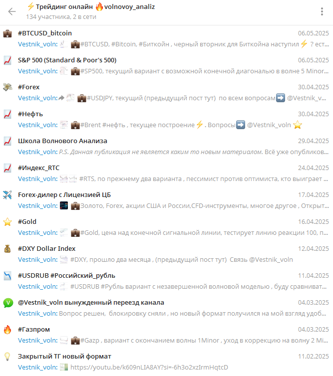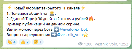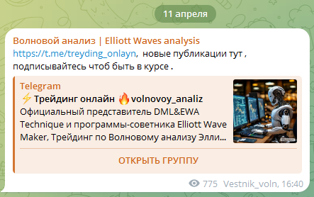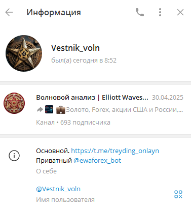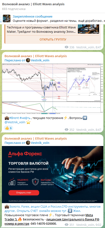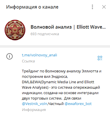 В профиле тг-канала Volnovoy anali указано, что ресурс предназначен для трейдинга, и в карточке группы закреплены ссылки на администратора Vestnik voln и торговый бот Ewaforex bot. На финансовую платформу подписано 693 аккаунта.