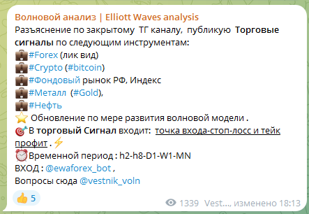 На телеграм-канале Волновой анализ Elliott Waves analysis подписчикам предлагается обучаться трейдингу и торговать на биржах, используя авторские индикаторы. Владелец комьюнити заявляет, что использует для получения прибыли метод Волнового анализа, и это позволяет его инвестициям наращивать профит. Мы решили выяснить, можно ли доверять идеям гуру торговли, и нет ли риска потерять с ним свои денежные средства.