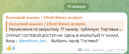 Судя по всему, зарабатывает этот персонаж как раз на продаже платных мест в своем ВИП сообществе. Доказательств проходимости его индикаторов никаких не предлагается. Поэтому мы считаем, что автор телеграм-комьюнити Волновой анализ Elliott Waves analysis занимается обычным обманом и разводом на деньги. Такой метод мошенничества широко распространен в среде аферистов. В реальности коммуникация с владельцем сервиса для торговли может привести людей, желающих заработать денег, к получению негативного опыта. Поэтому мы призываем пользователей держаться подальше от этой финансовой ловушки.