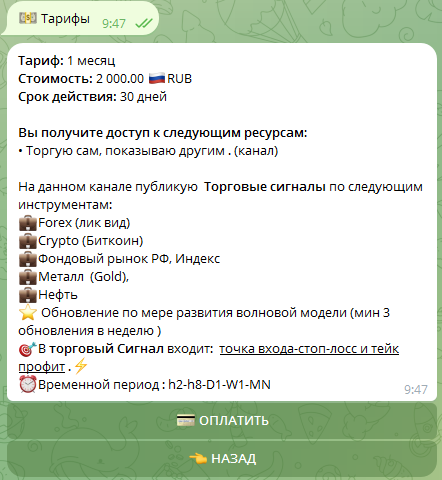 Базовая стоимость доступа в «приватку» на месяц составляет 2 000 рублей. Часто в комьюнити появляется возможность зайти на сервис на 1 день через бесплатный «гостевой» тариф.Бот «Платная подписка Торгую сам показываю другим» предоставляет пользователям базовую информацию о возможностях проекта и содержит кнопку «Оплатить».