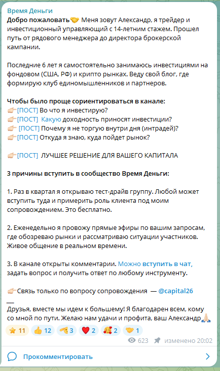 Все посты публикует трейдер Александр (@capital26), который заявляет о 14-летнем опыте работы в брокерской сфере. Проект подается как клуб единомышленников, где предлагаются аналитика по фондовому и криптовалютному рынкам. Автор публикует ссылки на прямые эфиры и закрытые группы сопровождения. Спекулянт обещает участникам высокий уровень компетенции и готовность помочь в формировании стратегии управления капиталом.