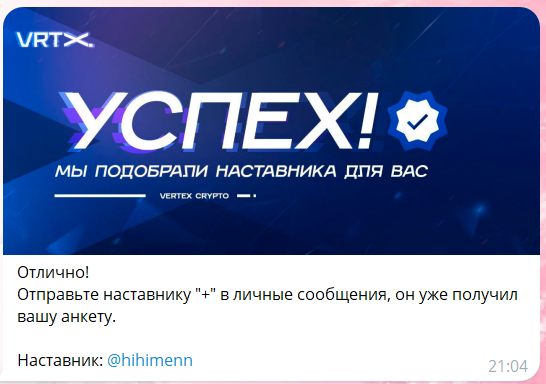 Вертекс крипто бот – перенаправляет на наставника, который привязан к совершенно другому проекту. Сообщество Vertex Crypto – удалено, предположительно из-за мошеннических действий. На канале Первые деньги в крипте, тот же самый контент и принцип работы. Наставник всего один, но личность не настоящая, т.к. имеет два одноименных, одинаковых аккаунта, где по стилю общения видно, что это разные люди.