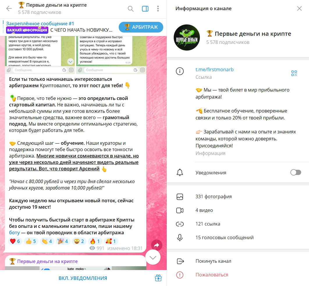 Ответив на них, куратор скидывает сообщество, совершенно несвязанным с Vertex Crypto. Это отдельный канал, называется – Первые деньги в крипте, который также про крипто-арбитраж и создан недавно: 17 декабря 2024 года. Тематика контента сильно схожа с Vertex: наборы на обучение, отзывы клиентов, суть арбитража и мотивация начать. Причём, у канала тоже есть бот, выбирающий в наставника того же Марка, но аккаунт другой – genius_imp.