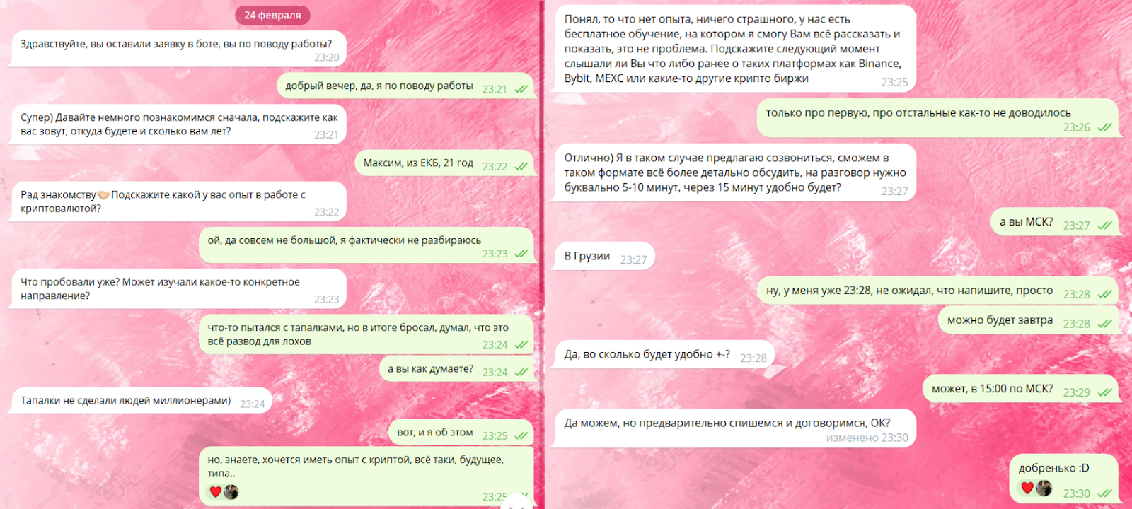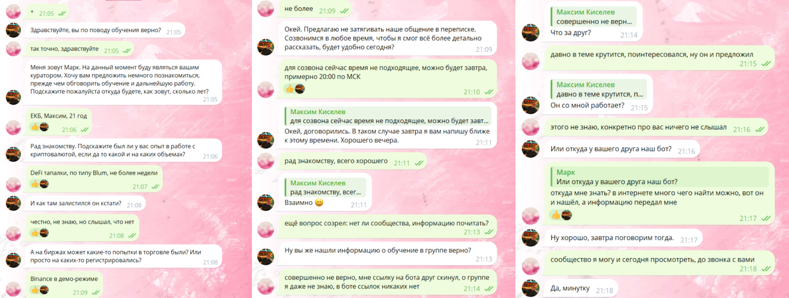 Дальше задают два вопроса: взаимодействовали ли вы ранее с криптовалютой и есть ли респонденту 18 лет. В зависимости от ответа, бот подбирает наставника и даёт его контакт. На деле, ответы никак не влияют на выбор наставника – он будет один и тот же. Имя пользователя куратора – hihimenn. Мы немного пообщались с ним, чтобы иметь более цельную картину.
