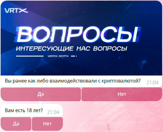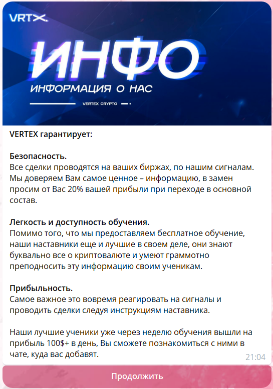 В сегодняшнем обзоре мы постараемся пройтись по доступной информации о Vertex Crypto, что делает бот, какие условия сотрудничества, пообщаемся с причастными к проекту, посмотрим на отзывы и сделаем выводы.