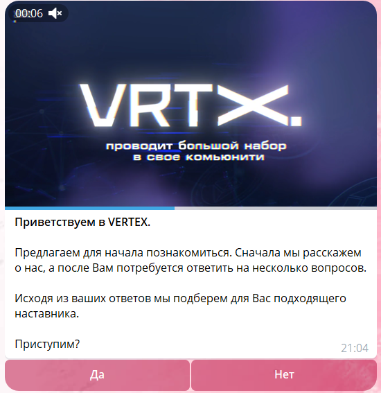 Бот представляет собой первый этап сотрудничества – знакомство с проектом и выбор наставника для сотрудничества. Вступительный ролик сообщает, что закрытая арбитражная команда Vertex проводит набор в комьюнити, ограниченный по времени.