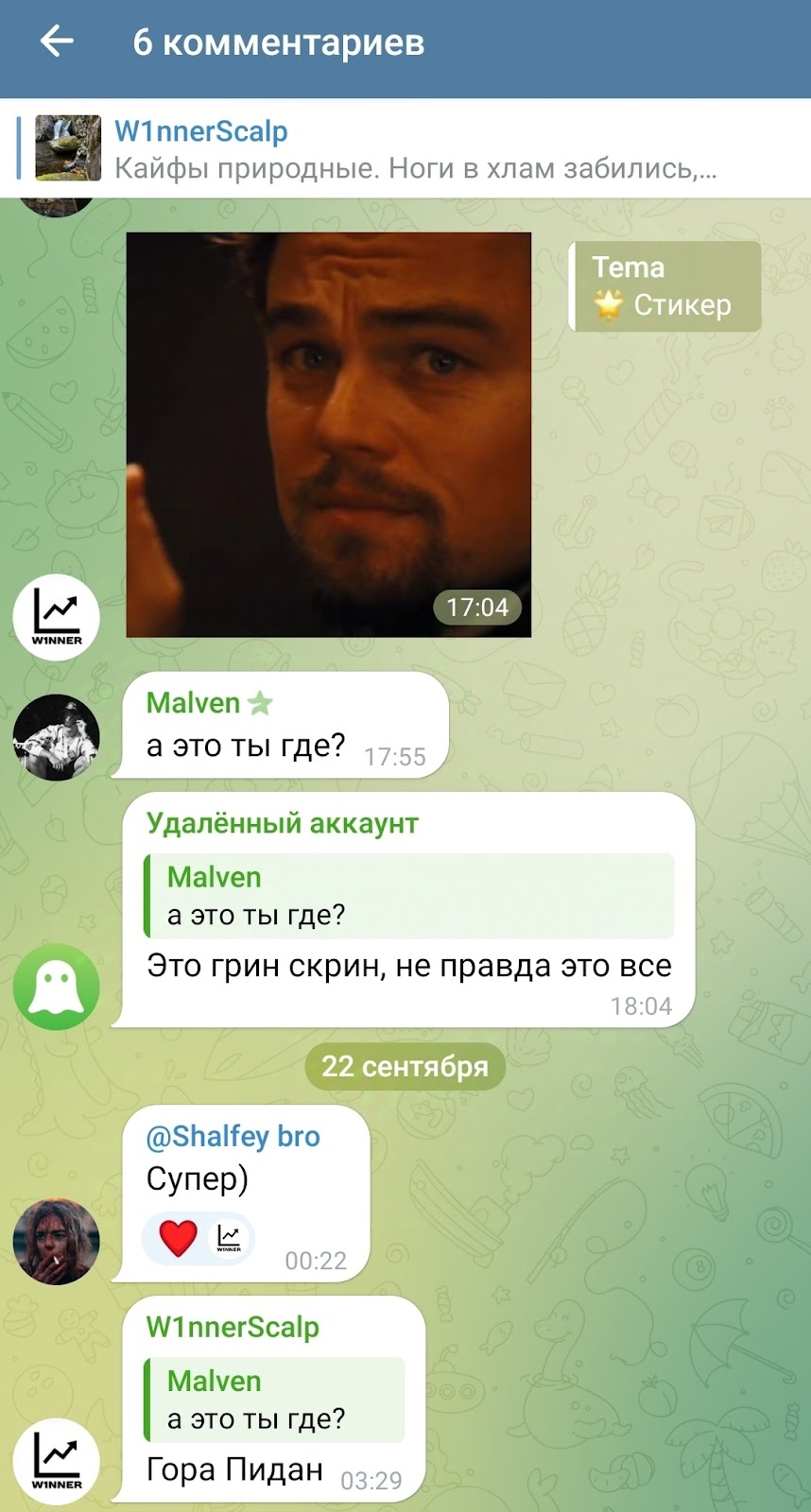 Дневник w1nner trader начал вести всего за три недели до того как начал работу в телеграмм-канале. Кроме статистики сделок и графиков, автор канала публикует личную информацию: где отдыхает, как живёт, как занимается спортом. Такие посты находят отклик у пользователей, поскольку они начинают видеть не просто инфо-цыгана, а живого человека делящегося разной информацией. При этом, не все полностью доверяют увиденному.
