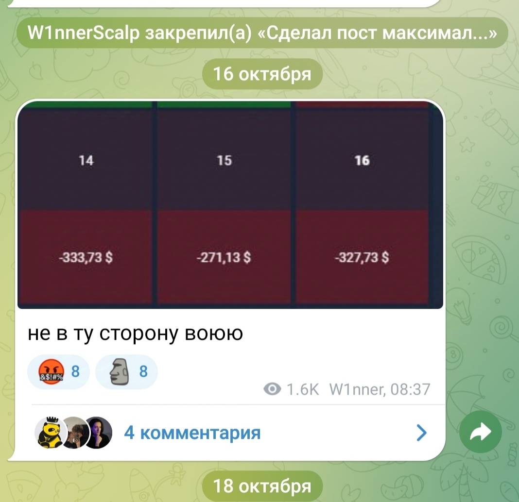 А значит, потенциальные ученики должны хорошо подумать, прежде чем действовать строго по торговой системе автора, а именно этого он требует во время обучения. Депозит может быть слит, и вам сообщат что вы сами виноваты. W1nner трейдер хоть и выкладывает посты личного содержания, но это не может являться никакой гарантией. Личность не установлена, никаких документов и разрешений на торговлю либо обучение.