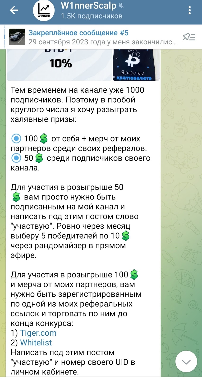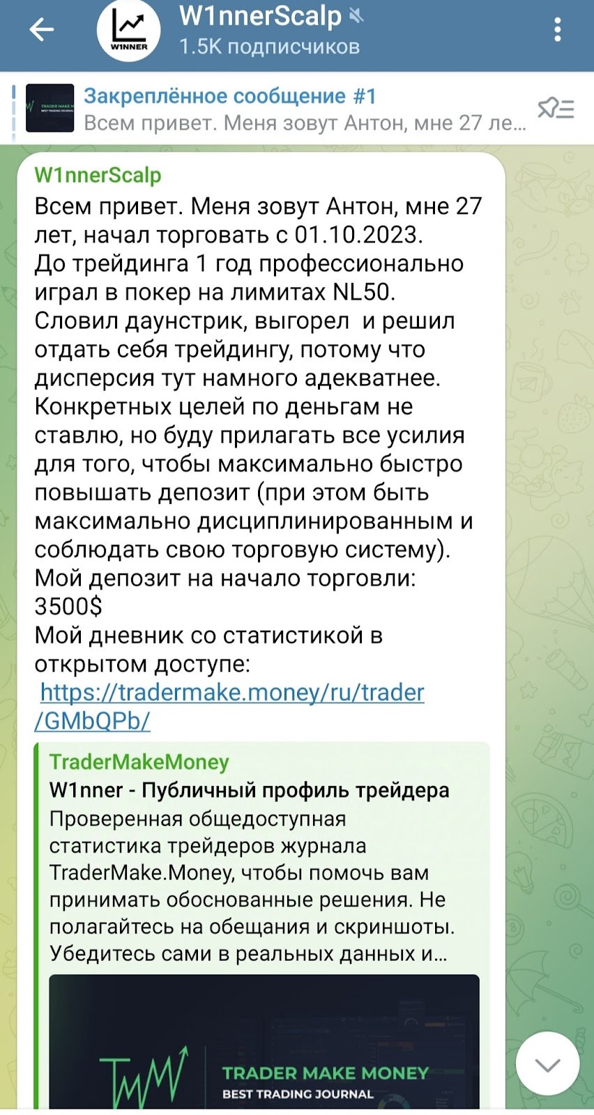 W1nnerscalp — телеграмм-канал с обучением скальпингу. Свою работу начал 27.10.23 г,но число подписчиков растет очень медленно: на данный момент их всего 1,5, аудитория при этом живая. Администратор и владелец канала, Антон с ником W1nnerss, предоставляет в доказательство своей успешности как трейдера ссылку на дневник со статистикой. Вот только проект на котором размещена эта статистика, сам имеет плохую репутацию в сети. Да и посмотреть, подробную историю автора невозможно.