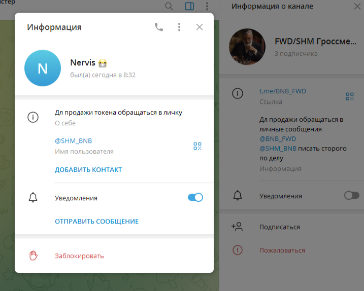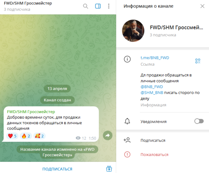 Как оказалось, телеграм-канал «WD SHM Гроссмейстер» @ BNB FWD был создан 13 апреля 2025 года. То есть два дня назад. За это время на него подписалось всего 3 подписчика. В описании блога указывалось, что для продажи нужно обращаться к нему в личные сообщения.