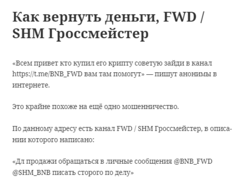 Также странно, что в первом сообщений на канале «WD SHM Гроссмейстер» @ BNB FWD он сразу решил предлагать свою услугу. Стоимость токенов блогер не указывает. Бесплатной базовой пользы, статистики и вообще какого-либо контента на канале нет.