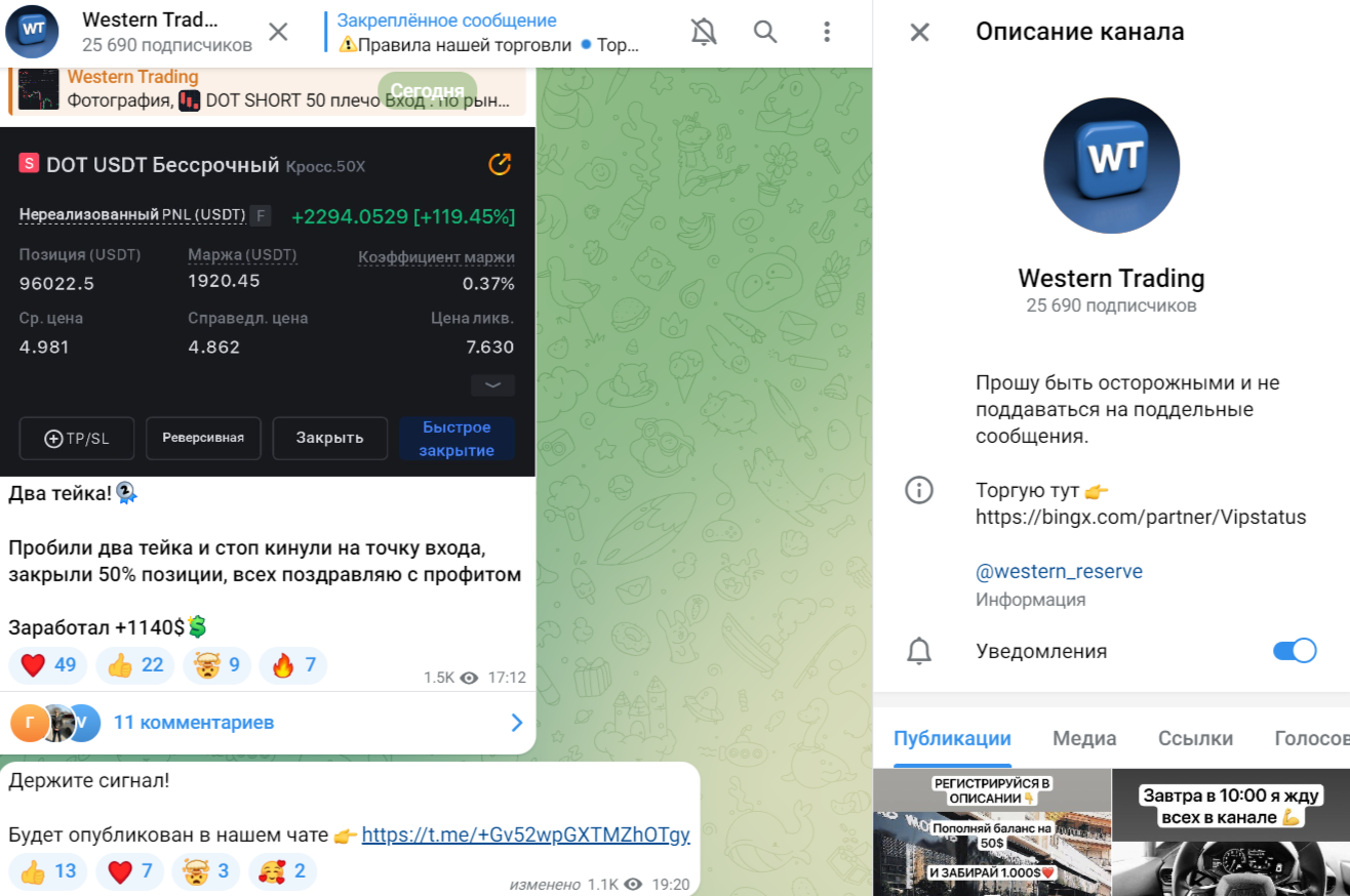 Telegram канал Вестерн Трейдинг ведет якобы известный трейдер, который торгует на бирже BingX. Своей личности он не раскрывает, не демонстрирует сертификатов и лицензий. Нельзя удостовериться, что он профессиональный трейдер, на его инвестиционные советы можно полагаться.