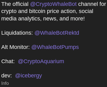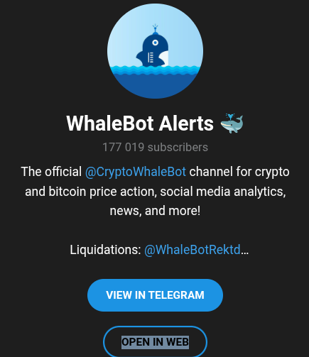 К вышеперечисленному добавим, что команда сообщества прикрепила адреса на каналы с ликвидациями сделок WhaleBot Rektd. На основном канале нет информации по другим криптовалютам, но админы указали на структуру, где есть данные по альткоинам — WhaleBot Pumps. Есть еще ссылка на онлайн-чат с пользователями — Crypto Aquarium и на разработчика — icebergy.