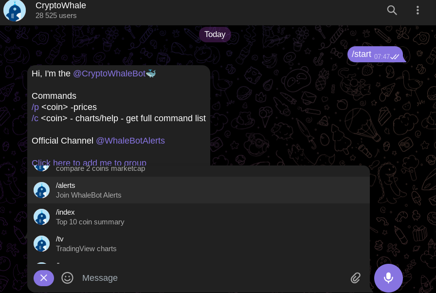 CryptoWhaleBot — консультационный проект в телеграмме, где якобы в режиме реального времени программное обеспечение публикует информацию о трансферах и сделках крупных игроков на финансовых рынках. Разработчики сообщества акцентируют внимание на различных рынках, включая криптовалюты, акции, «Форекс».