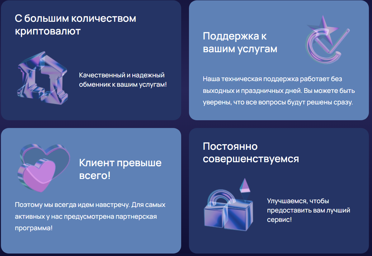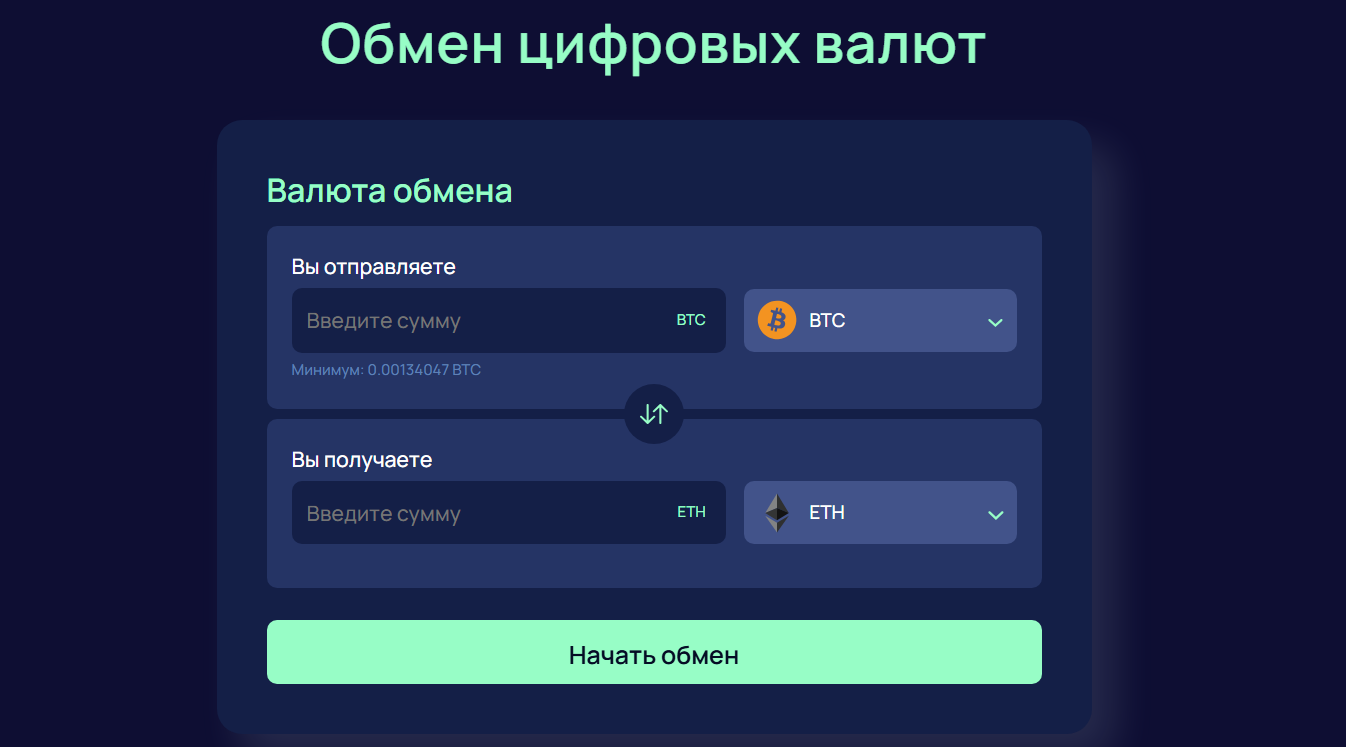 На главной странице сайта компании нас встречает форма для обмена цифровых валют. Согласно ей, трейдеры должны лишь выбрать количество и вид отправляемой и получаемой криптовалют. После нажатия на «Начать обмен» откроется новая страница, на которой будет необходимо поделиться номером крипто-кошелька, а также, скорее всего, данными о ФИО и контактной информацией.