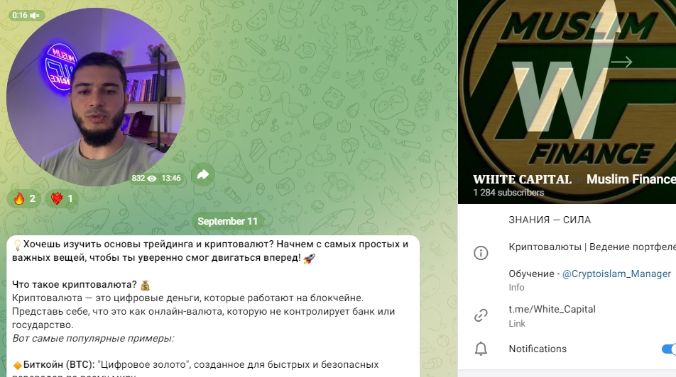 White Capital (Muslim Finance) – канал в Телеграмме неизвестного трейдера. Аккаунт для связи – Cryptoislam MENEGER. Рассмотрим подробнее содержание постов и отзывы о деятельности трейдера.