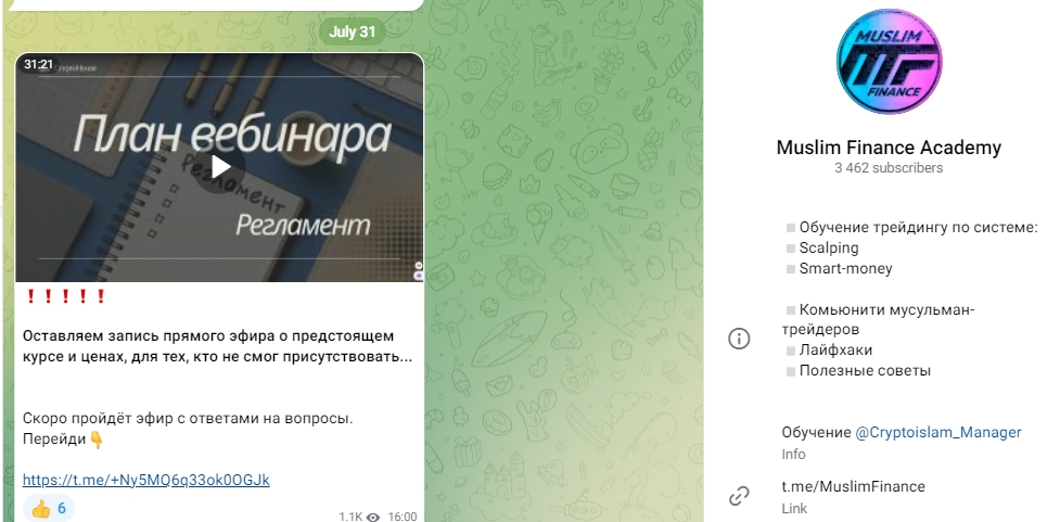 На канале Muslim Finance Academy предлагается платное обучение. Также трейдер публикует отзывы от довольных учеников, но мы склонны доверять только тем мнениям, которые оставляют о подобных проектах с платными курсами и консультациями, сами пользователи на независимых ресурсах.