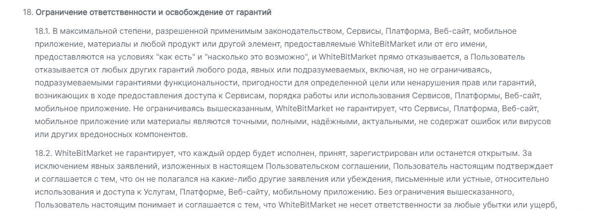 Платформа гарантирует высокий уровень безопасности средств. 96% цифровых активов хранятся на холодных кошельках. Чтобы предупреждать хакерские атаки, на WhiteBitMarket используется WAF. Для защиты финансов и личных данных клиентов последним выплачивается вознаграждение в размере от 500 до 5 тысяч долларов, если они найдут уязвимые места в системе.Примечательно, что в то же время в соглашении прописан отказ компании от ответственности за любой ущерб, нанесенный пользователям.
