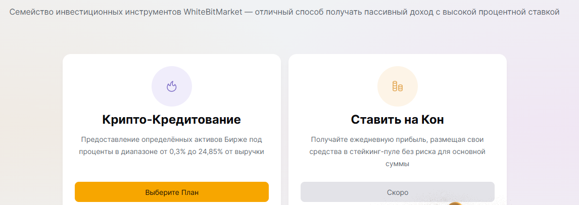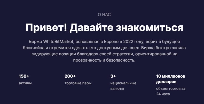 Сайт WhiteBitMarket поддерживает около 10 языков, среди которых есть и азиатские. На главной странице перечислены основные активы для торговли. Понятный интерфейс, безопасность средств названы основными плюсами площадки.