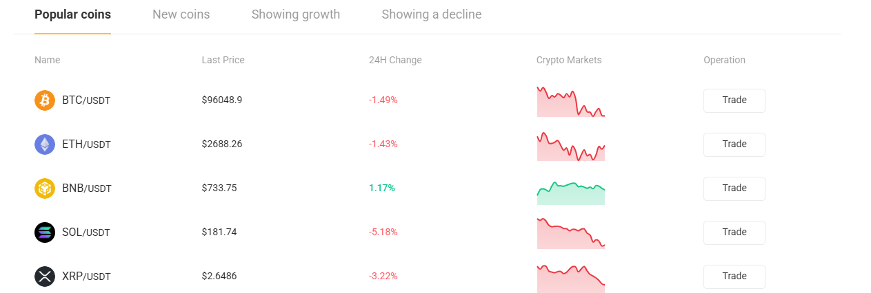 Ежедневные сборы за использование активов — 0,078%, комиссия за торговлю — 0,1%. На платформе доступно криптокредитование под 0,3-24,85% от выручки в соответствии с выбранным тарифным планом.